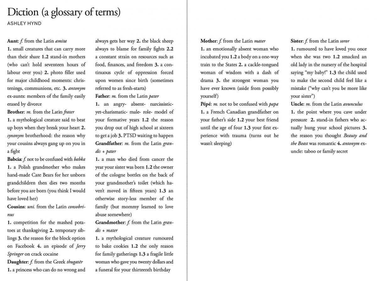 Aunt: f. from the Latin amita 1. small creatures that can carry more than their share 1.2 stand-in mothers (who can’t hold seventeen hours of labour over you) 2. photo filler used for major childhood moments: christenings, communions, etc. 3. antonym ex-aunts: members of the family easily erased by divorce