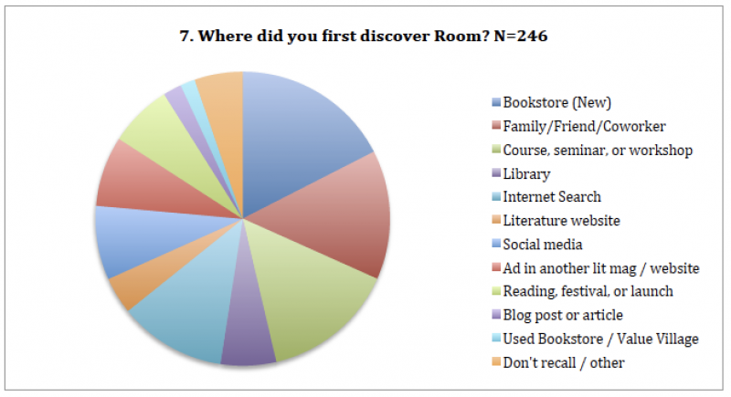 The most popular reasons for reading Room were (1) To support women’s literature (68.7%), (2) To read fiction, poetry, and CNF (63.8%), and (3) To support Canadian literature (63.4%). 80.5% of readers said that the fact that Room only publishes authors and artists who identify as women or genderqueer was important to them.