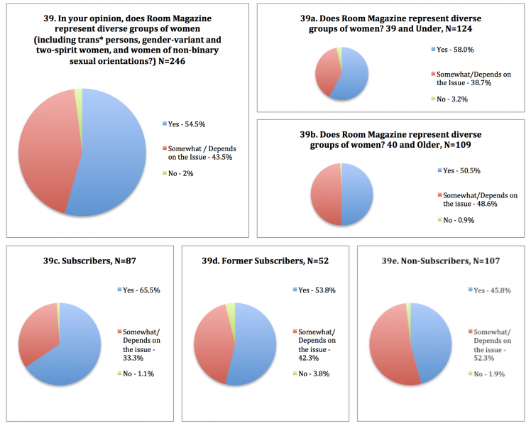54.5% of readers said they believe Room represents diverse groups of women, while 43.4% of readers said that Room somewhat represents diverse groups of women (depending on the issue). Only 2% of readers said that they believed Room did not represent diverse groups.