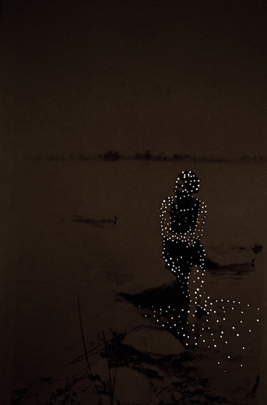 My own albums (some quite old and given to me by my Nonna) hold images that are lost, despite being housed in the albums. Nobody is able to identify the people in the photographs. I aimed to make these pictures precious again, to somehow validate that loss. Initially, I began by embroidering on the photographs to transform them into a “new object.” While sewing, I would hold the photograph to the light in order to determine the placement of the pinholes. I recognized that the pinholes and subsequent light shining through were far more interesting to me and decided to work toward exploring that avenue of my process.